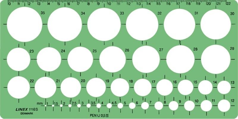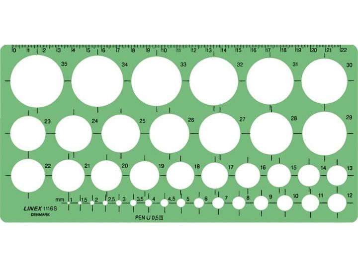 Indholder 39 cirkler med diameter fra 1 til 35 mm inklusive 1,5 – 2,5 – 3,5 – 4,5 mm.