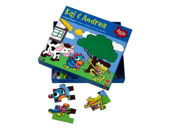 Pahvipalapeli, jossa on Kaj ja Andrea, vähintään 3-vuotiaille lapsille. Sisältää: 2 palapeliä, joissa kummassakin on 25 palaa, hyvä ja kestävä laatu