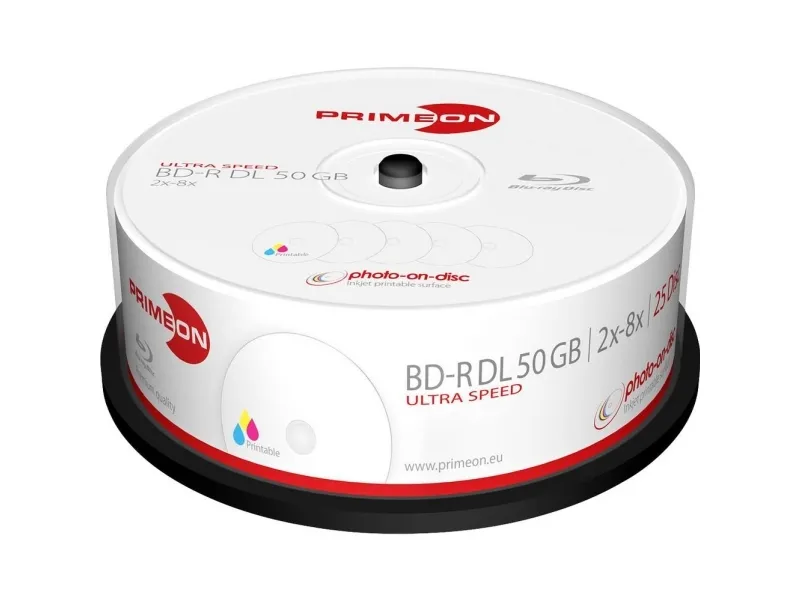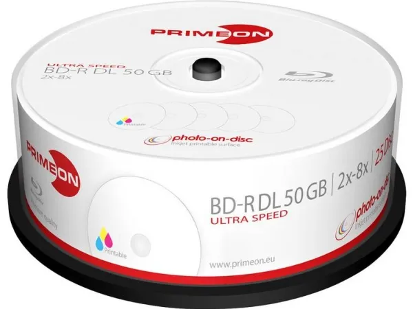 Primeon BD-R DL 50GB/2-8x cakebox (25 Disc )Med Primeon Blu-ray-medier i høj kvalitet kan store datamængder gemmes ganske enkelt, pålideligt og takket være 8x ULTRA SPEED også ekstremt hurtigt. Uanset om det er Full HD-film, huskestykker eller systembackups: Med 50 GB kapacitet på de to lags Blu-ray-diske er der rigelig plads til arkivering af data af enhver art.