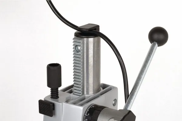 PoratelinePylväs , jossa ruuvattu veitsikisko - Ei kääntymistä porauksessa ja jyrsinnässä - Vakaa levy harmaasta valuraudasta - Sis. integroidun palautusjousen ja syvyyspysäyttimen - Lukitusnuppi sarjaporausta varten - Säädettävä asteikkorengas millimetrin tarkkaa poraussyvyyttä varten - Työpinta jyrsitty kiinnitysuralla kiristysraudan/ruuvimeisselin kiinnittämistä varten - Kaapelipidikkeellä - Tähtikahvalla - 5 vuoden takuu. Litteiden, pyöreiden materiaalien ja listojen ehdottomantarkkaan poraukseen