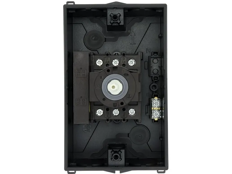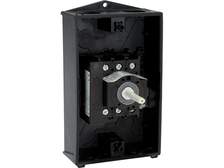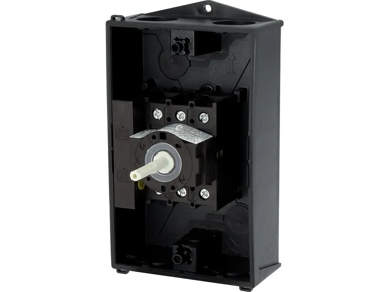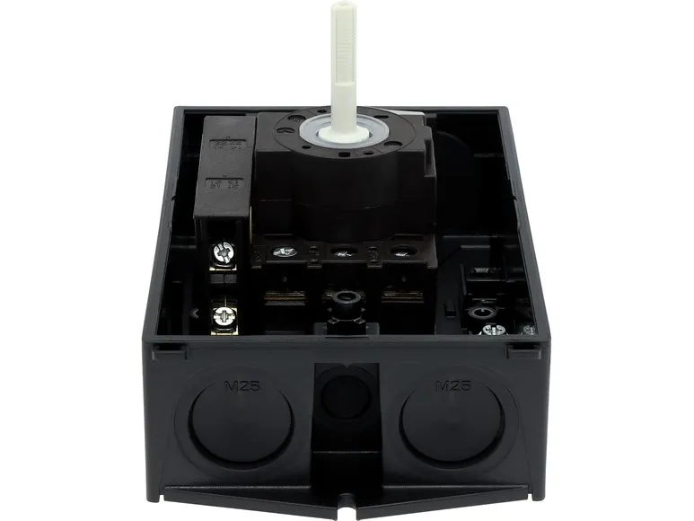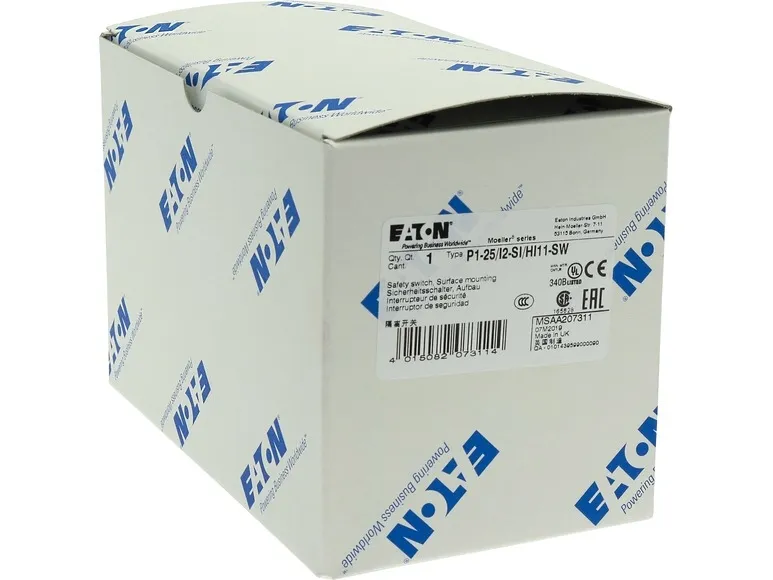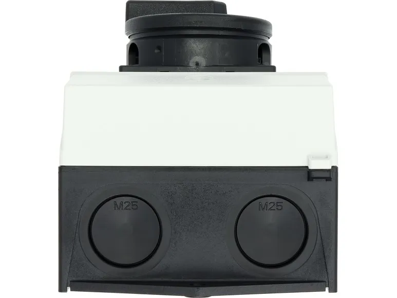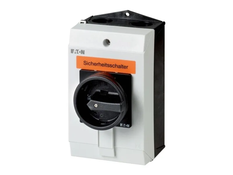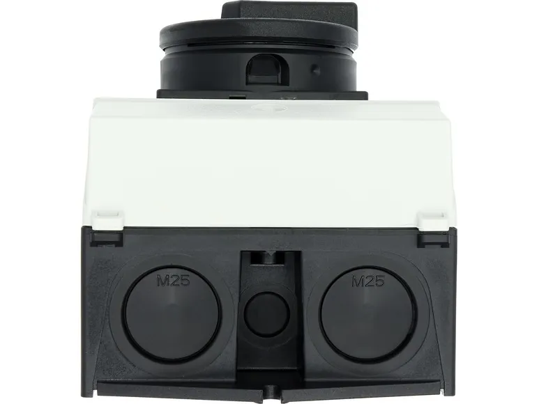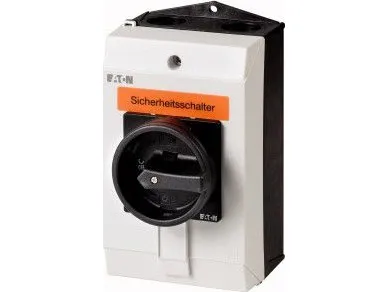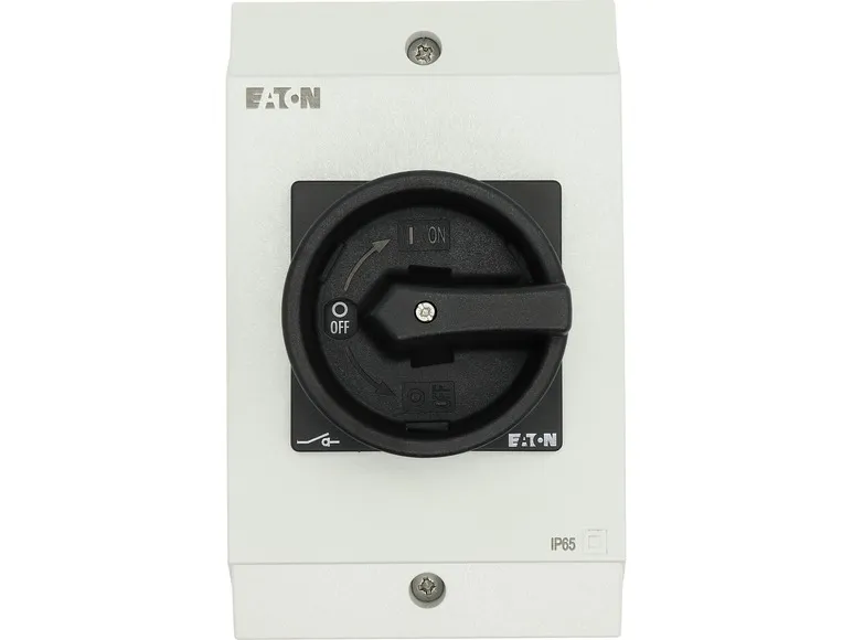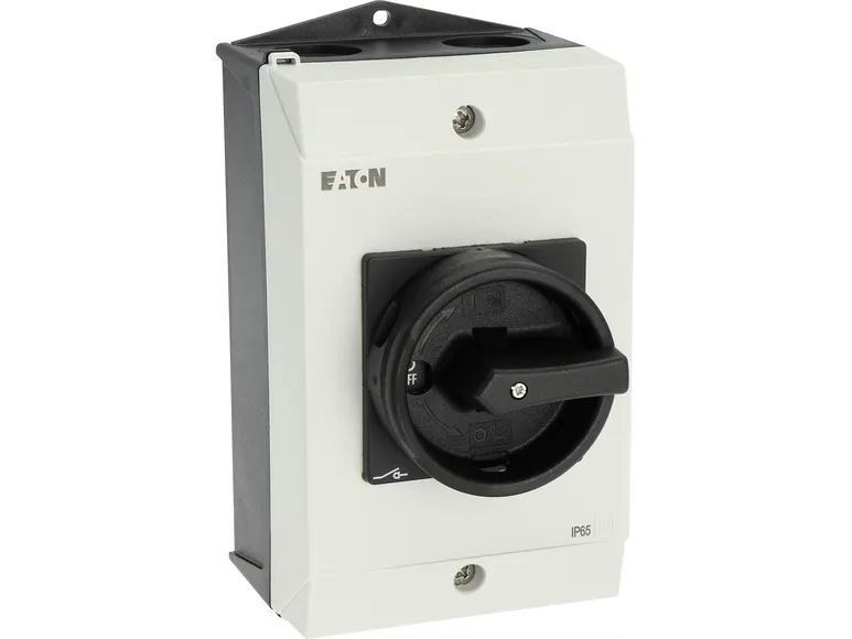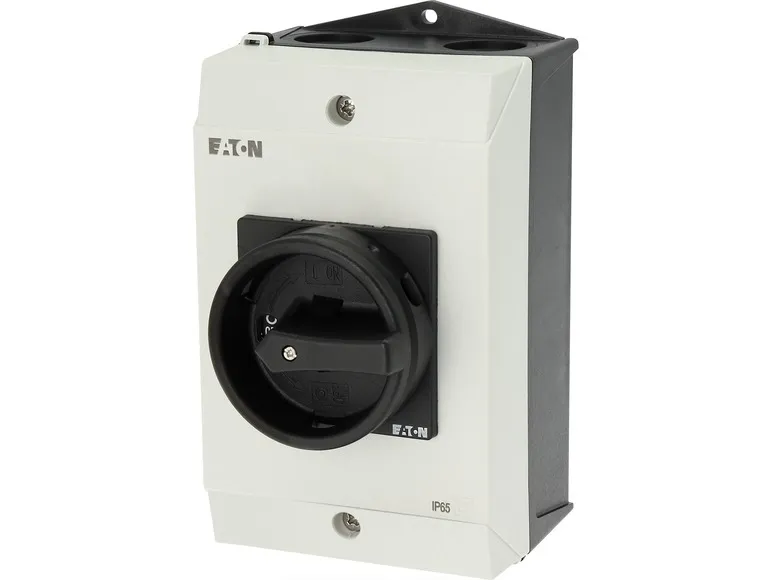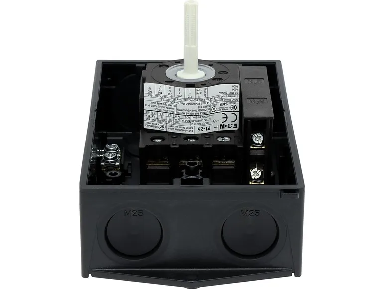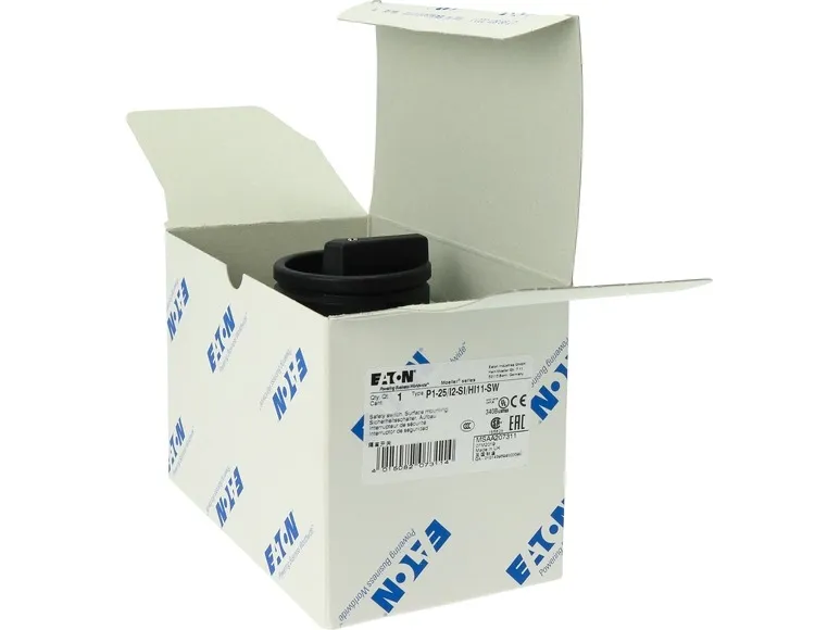 Safety switch, P1, 25 A, 3 pole, 1 N/O, 1 N/C, STOP function, With black rotary handle and locking ring, Lockable in position 0 with cover interlock, with warning label „safety switch” Safety switch, Product range: safety switch, Part group reference: P1, Stop Function: STOP function, With black rotary handle and locking ring, Notes: with warning label „safety switch”, Information about equipment supplied: Auxiliary contact or neutral conductor fitted by user., 3 pole, Locking facility: Lockable in position 0 with cover interlock, Degree of Protection: IP65, Design: surface mounting, Motor rating AC-23A, 50 - 60 Hz 400 V: P = 11 kW, Rated uninterrupted current: Iu = 25 A, Standards: IEC/EN 60947, VDE 0660, IEC/EN 60204, Switch-disconnector according to IEC/EN 60947-3