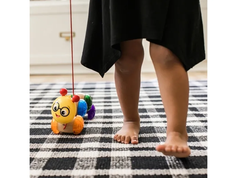 Hape puusta ja muovista valmistettu vetolelu, jonka pää liikkuu hauskasti, kun sitä vetää irti. 25 cm pitkä.