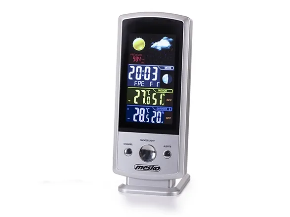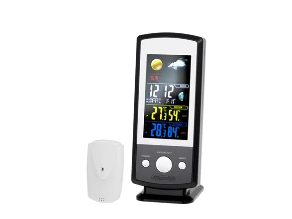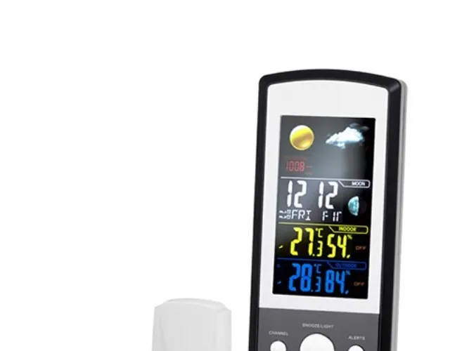 Colorful digital display, Weather forecast, Moon Cycle display, Time and date display, 2-time alarms and 2-temp. alerts, Celsius and Fahrenheit temperature display, 1 probe, Outdoor and indoor temperature and humidity reading.