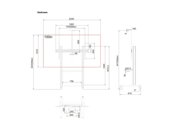 Multibrackets 9103, 90 kg, 2,54 m (100"), 165,1 cm (65"), 100 x 100 mm, 1000 x 600 mm