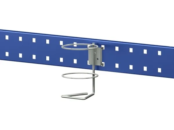 Suihkupullonpidike, jonka mitat ovat Ø75 x 100 mm, toimitetaan 1 kpl:n kpl:ssa. Sopii rei'itetyille työkalulevyille, joissa on 9 x 9 mm:n reikä, c/c 38 mm. Koukut toimitetaan sis. lukitusruuvin.