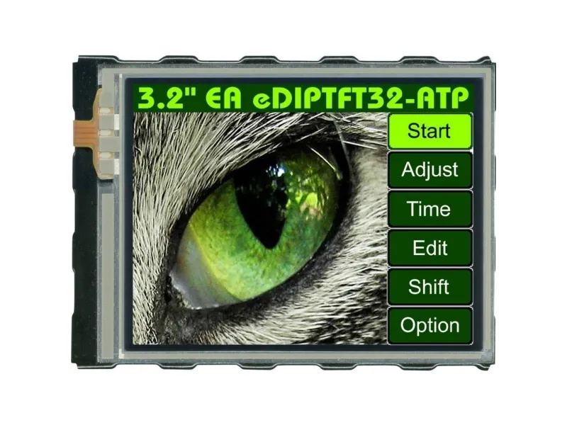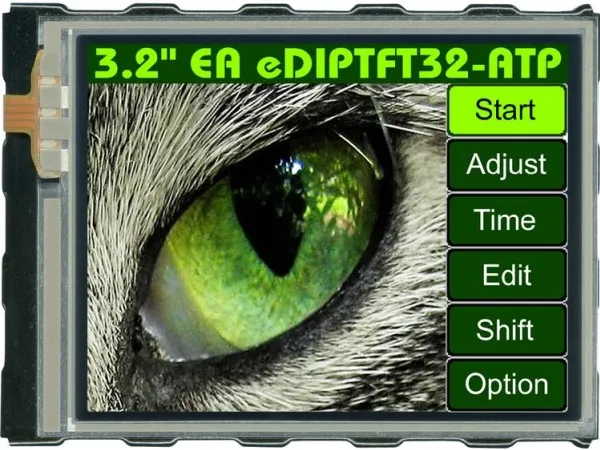 Mittarit, näytötTekninen TFT-värinäyttö, jonka tarkkuus on 320x240 pistettä (3,2 1/4-VGA) ja integroitu kosketuspaneeli. Sisältää RS-232-, SPI- tai I2O2-väyläliitännän. 2,54 mm:n rasterinastoilla pistorasioita tai juotosasennusta varten piirilevylle. Merkistö- ja grafiikkatoiminnot ovat jo sisäänrakennettuja. FLASH-piuhalla kuvien, tekstien ja kokonaisten näytön sivujen lataamista varten. Kiinnitys tapahtuu integroitujen nastojen tai mukana toimitettujen kielekkeiden avulla tai lisävarusteena saatavan kiinnitystelineen avulla.