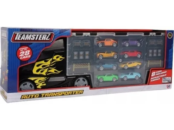 Teamsterz Metro City Autotransporter and 4 cars. The durable carry case features independent free-moving wheels, a carry handle for mobile play, storage space for up to 28 cars and opening doors on both sides. The 4 Teamsterz vehicles included are approximately 3-inch scale and feature a high-quality die-cast body with independent free-moving wheels. Aiding the development of your little one’s cognitive and fine motor skills this is the perfect size for push along play. The Metro City Medium Auto Transporter is the perfect gift for any enthusiastic little driver, offering hours of imaginative fun. Suitable for ages 3 years +.