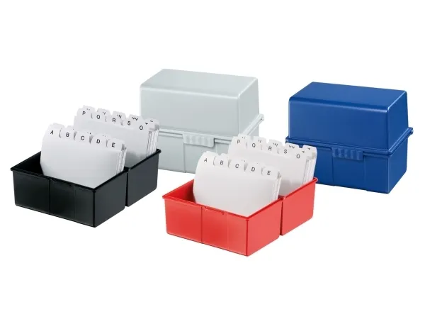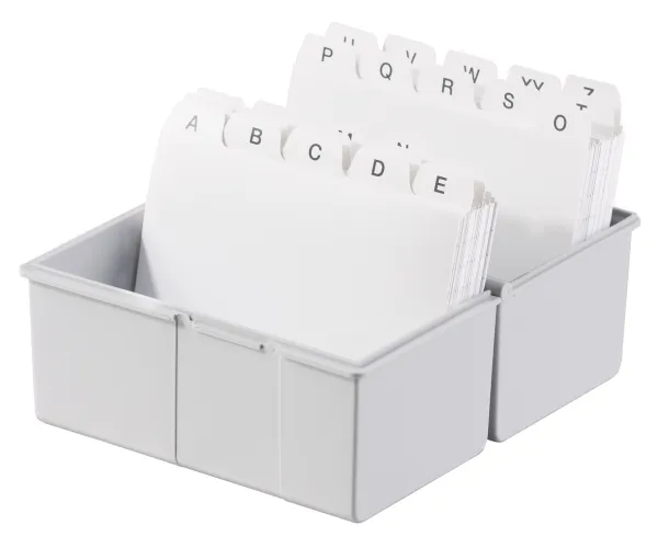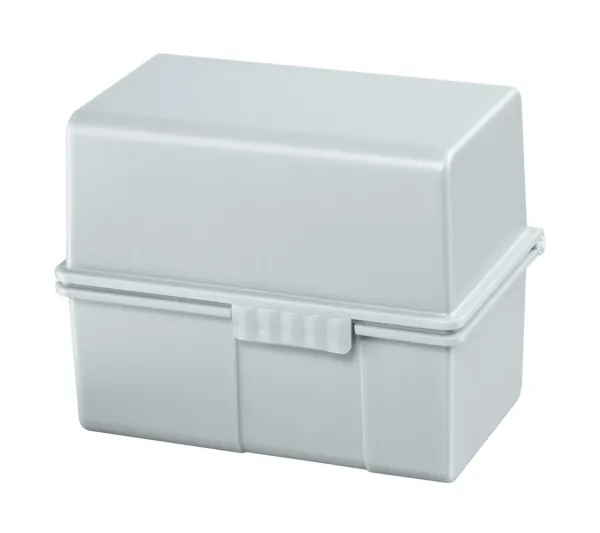 - Card index box A8\n- the MEMO-Box which keeps everything under wraps: for learning, for reference purposes, for collecting\n- for mobile use or and at home\n- high-quality design with spring lock and steel hinge\n- the lid tilts back completely and can be used as an additional tray\n- equipped with 100 lined index cards and A-Z guide cards\n- Capacity: 300 index cards A8\n- Size (W x H x D): 89 x 71 x 58 mm\n- Colour: light-grey