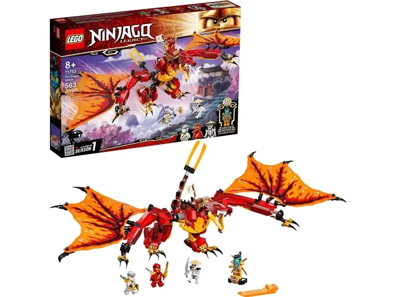 Ninja fans will love playing out aerial adventures from season 1 of the LEGO® NINJAGO® TV series with the updated Fire Dragon Attack (71753) playset. The impressive dragon toy is ideal for inspiring gripping roleplay action with its posable tail, legs, jaw and wings.Guaranteed thrills for passionate ninja fansThe toy construction set is packed with 4 cool minifigures: ninjas Kai, Zane and Nya Legacy, plus their fierce enemy Wyplash, for kids to stage epic good vs. evil clashes. New for June 2021, Nya Legacy is a never-seen-before golden, collectible minifigure with a stand to celebrate 10 years of NINJAGO playsets.Unique toys for imaginative buildersLEGO NINJAGO toys provide kids with an escape to a fantasy world of amazing action where they can team up with their heroes to take on a cast of fearsome villains as they play with a wonderful collection of building kits including mechs, bikes and dragons.