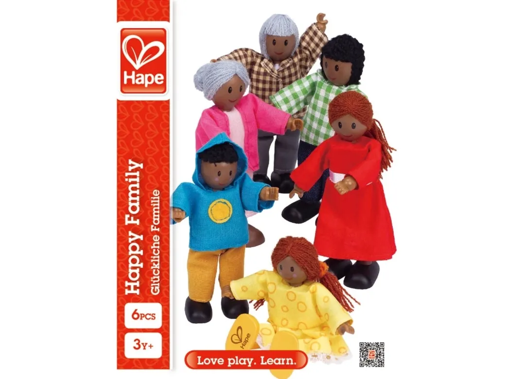 Perheeseen kuuluu 2 aikuista ja 4 lasta. Materiaali: puu. Mitat: 7 - 13 cm.