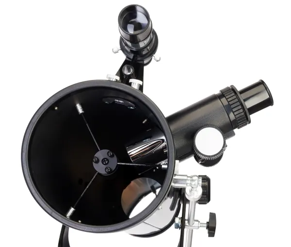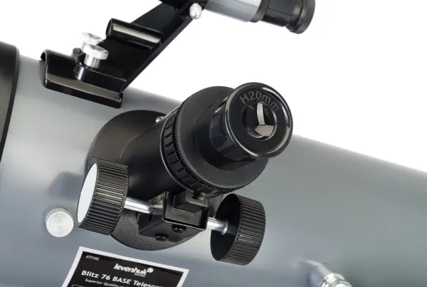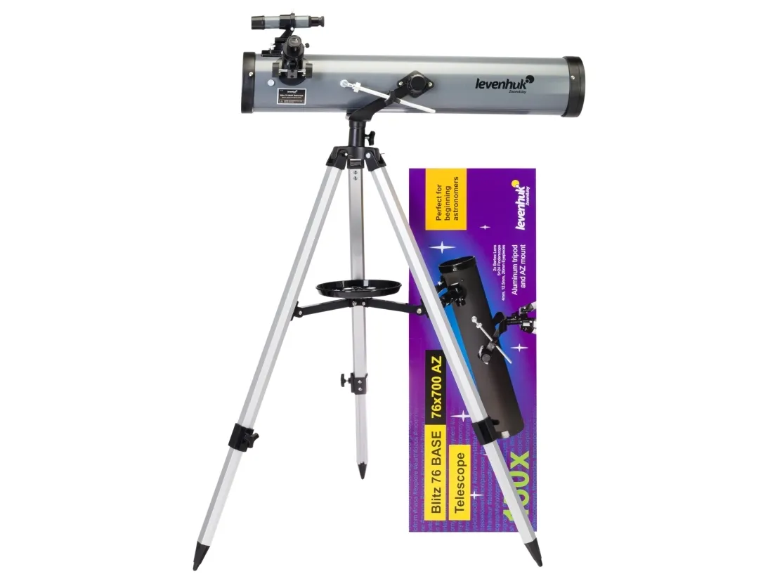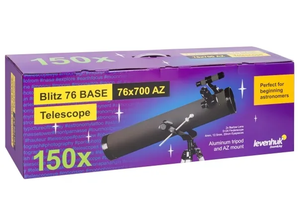 The Levenhuk Blitz 76 BASE telescope is a Newtonian reflector with a spherical primary mirror. This is an entry-level model, but it allows you to observe many objects of outer space and deep sky. You can study the Moon, earth-type planets, and binary stars as well as large globular and open clusters. Almost all objects of the Messier catalog are available for study but without a high degree of detail.