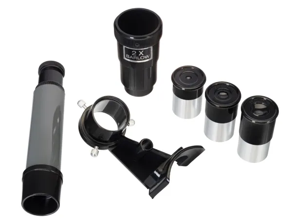 Its optics are made of glass with an anti-reflective coating. As a result, the image transmitted by the telescope is sharp and clear. You can observe with good clarity up to 152x magnification. Due to three eyepieces with a different focal length and a 2x Barlow lens in the kit, you can work with a large number of multiplicities.