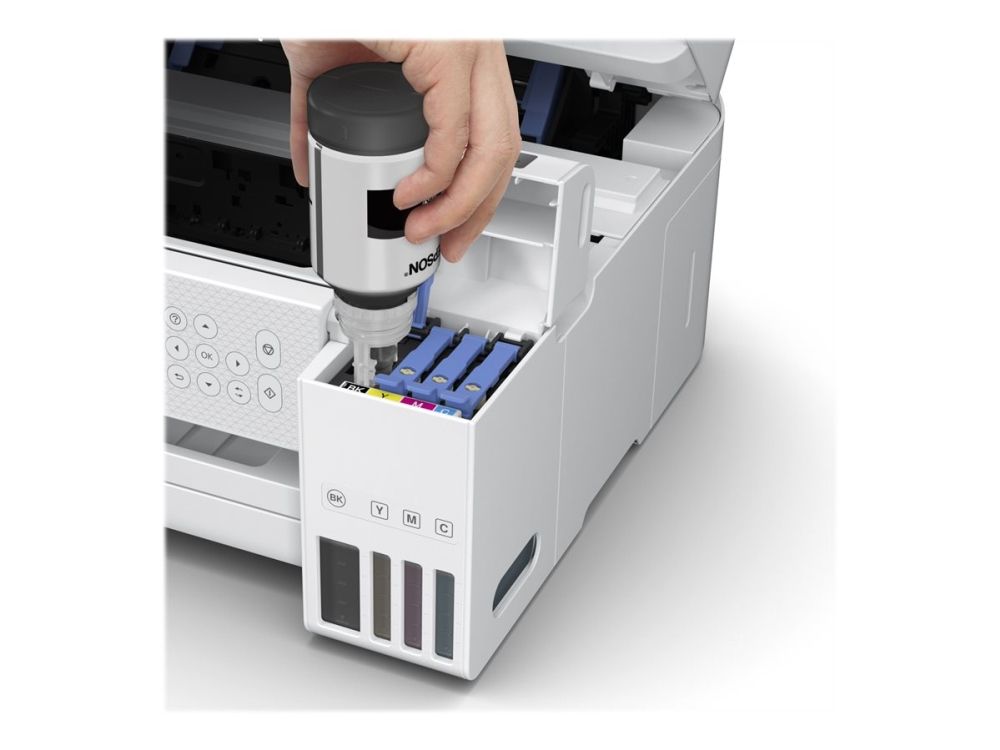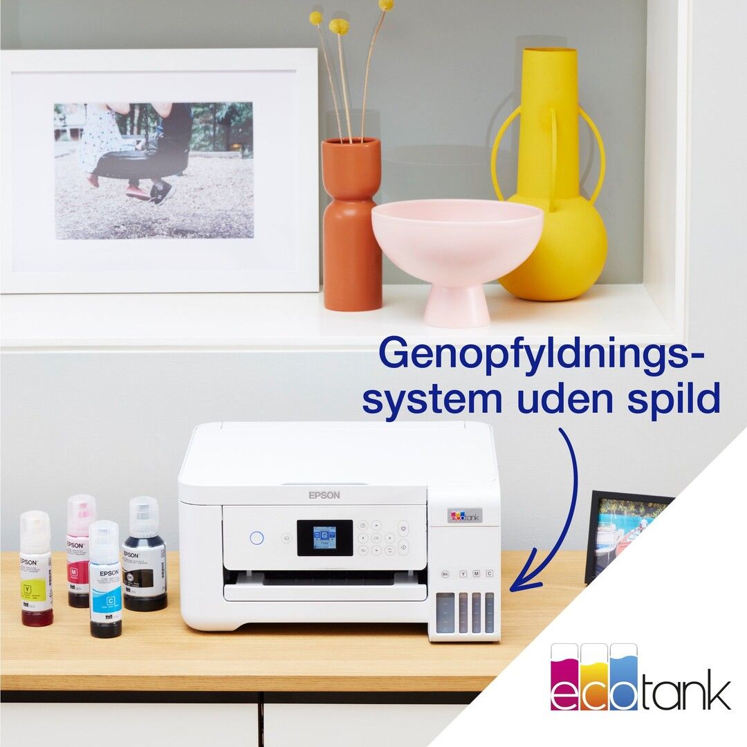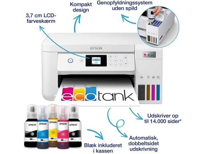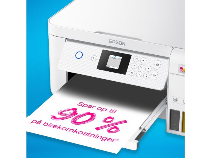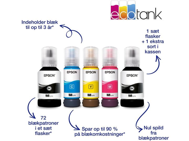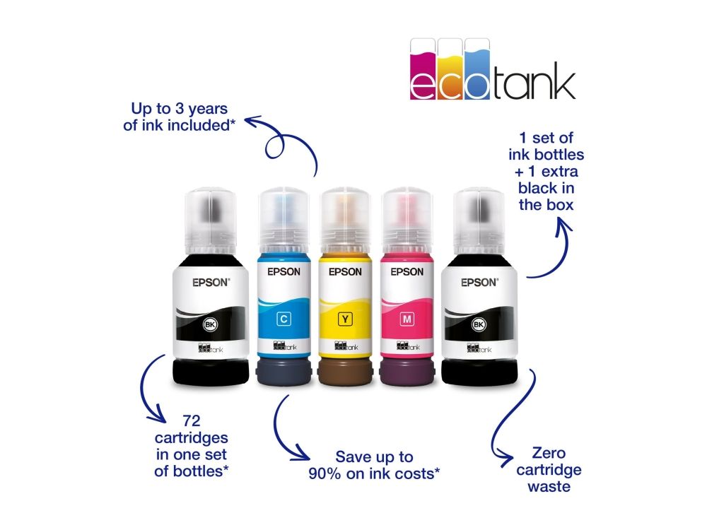 Epson EcoTank -tulostimessa ei ole mustekasetteja - säästät jopa 90 % tulostuskustannuksissa. Tulostimen mukana toimitetaan riittoisat mustepullot ja tulostimeen integroidut mustesäiliöt on helppo täyttää riittoisista mustepulloista. Uudelleentäytettävät mustesäiliöt, joustavat liitäntäominaisuudet ja kaksipuolinen tulostus tekevät tästä täydellisen tulostimen kaikille, jotka haluavat korkealaatuisia tulosteita uskomattoman alhaiseen sivuhintaan.