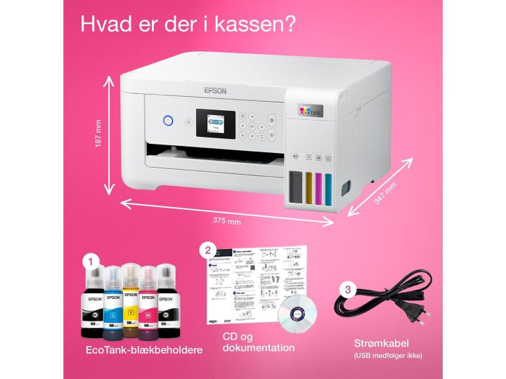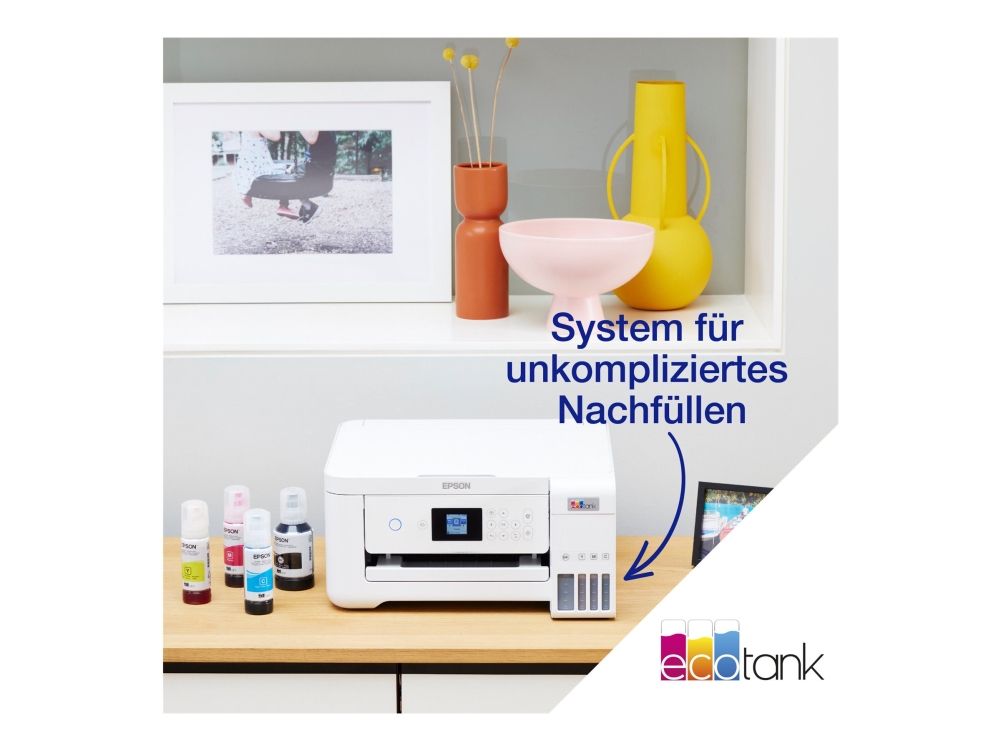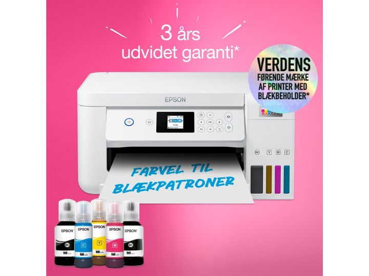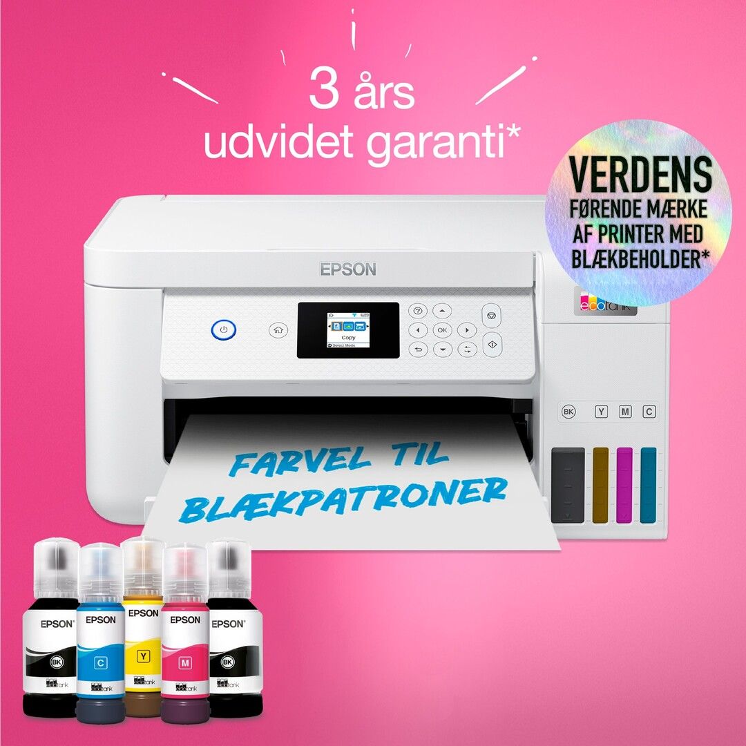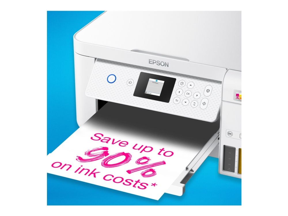 Epson EcoTank -tulostimessa ei ole mustekasetteja - säästät jopa 90 % tulostuskustannuksissa. Tulostimen mukana toimitetaan riittoisat mustepullot ja tulostimeen integroidut mustesäiliöt on helppo täyttää riittoisista mustepulloista. Uudelleentäytettävät mustesäiliöt, joustavat liitäntäominaisuudet ja kaksipuolinen tulostus tekevät tästä täydellisen tulostimen kaikille, jotka haluavat korkealaatuisia tulosteita uskomattoman alhaiseen sivuhintaan.