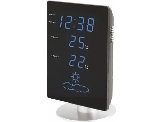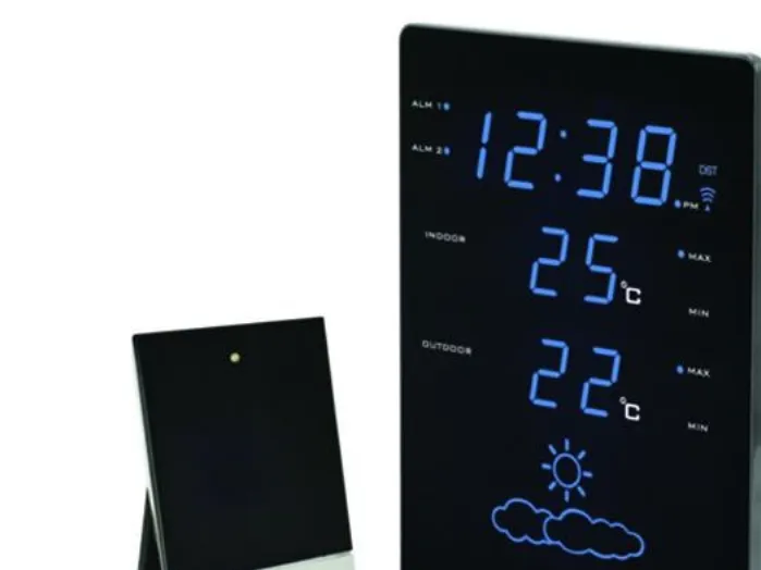 -Radio Controlled Clock with manual time setting option. \n-12/24 h display. \n-2 alarms with snooze. \n-Indoor and outdoor temperature in °C. \n-MIN/MAX recording for indoor and outdoor temperature. \n-Weather forecast with weather icons. \n-weather tendency indicator. \n-Blue coloured LED. \n-Dimmer funktion.