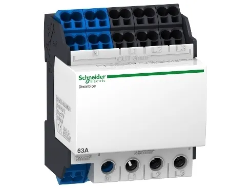 Linergy DX 4P distribution blok 63A 4 moduler, 72mm tilslutning 25mm2 i bund og 24 fjederklemmer i top. Designet til PrismaSet tavler og løsninger til effekt distribution med fjederklemmer for enkelt montage. It is dedicated to 4P installation. It provides tunnel type terminal for the supply circuit with a cable cross section of 16mm² for flexible cables or 25mm² for rigid cables. It provides 24 holes for quick connections at the botom of the product. 12 spring terminal outgoers for phase and 12 spring terminal outgoers for neutral are available for distribution part. The allowed cable cross section is comprised betrween 2.5mm² and 6mm² for flexible and rigid cables. The Ue rated operational voltage is 440VAC. The Ui rated insulation voltage is 500VAC. The Uimp rated impulse withstand voltage is 6kV. The In rated operational current is 63A. It provides IPxx B degree of protection. Its resistance to incandescent wire is 960°C. It is intented for residential or small commercial buildings. Its width takes 4 modules of 18mm. Its weight is 290g. It complies with IEC60947-7-1 and IEC61439-1 standards.
