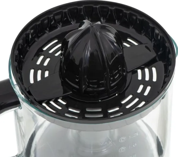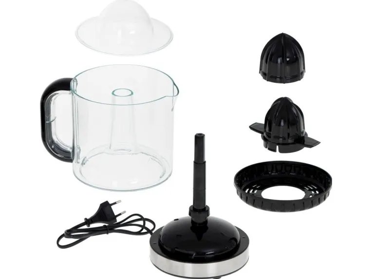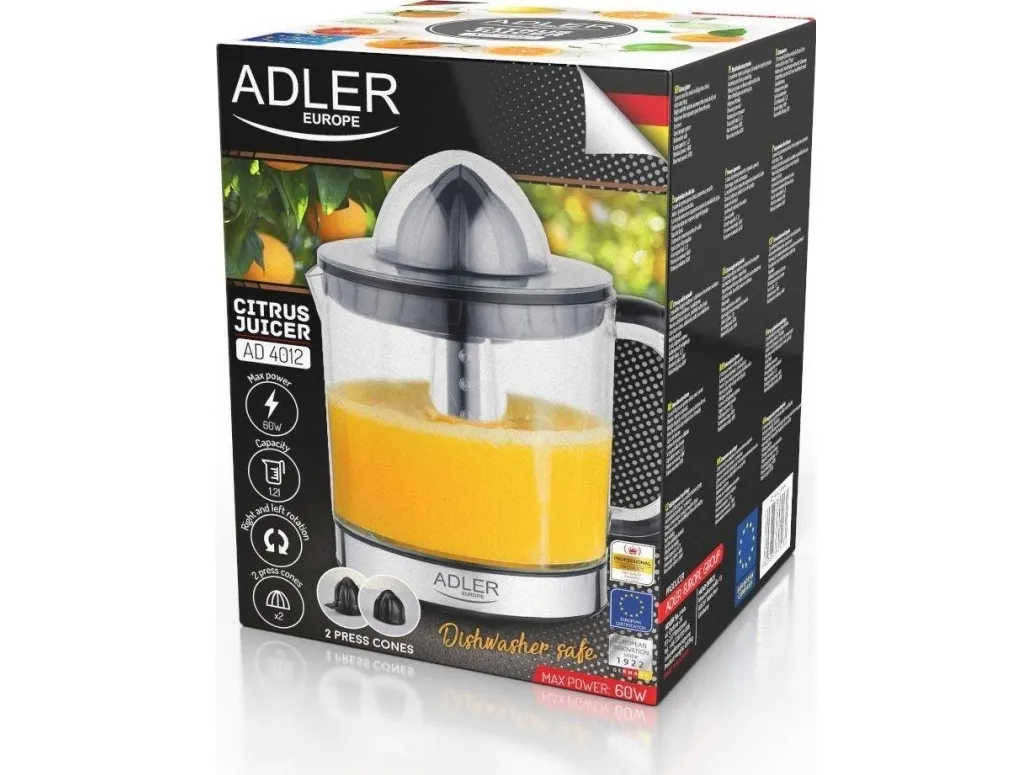 Tea with lemon, grapefruit juice for breakfast or squeezing orange juice to cook the duck in oranges from now on will not be associated with a sore hand and juice stains on the countertop and kitchen floor. The device consists of a container, a lid, a pulp sieve separating the juice from the pulp and two replaceable press cones. The strainer guarantees a liquid without any particles or fruit seeds floating in it. On the other hand, the cones make it easier to squeeze the juice from smaller and larger citrus fruits, which is especially important if you are fans of grapefruit juices. The juicer is equipped with an automatic start/stop function and rotation to the right and left, which allows you to conveniently control the operation of the device and allows you to produce much more juice than with traditional manual methods. The retractable cord makes it easy to store the device in a cabinet, so it does not take up much space.Adler AD 4012. Product type: Hand juicer, Product colour: Black, Juice container capacity: 1.2 L. Housing material: Glass. Weight: 750 g. Package width: 165 mm, Package depth: 230 mm, Package weight: 900 g