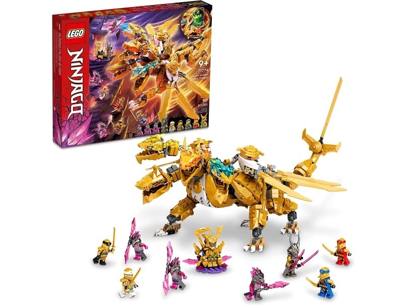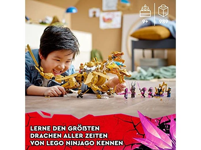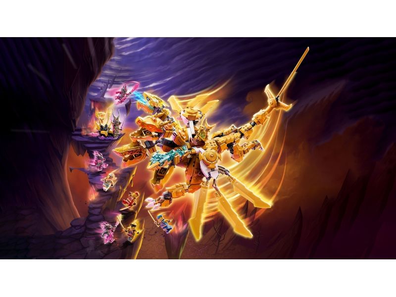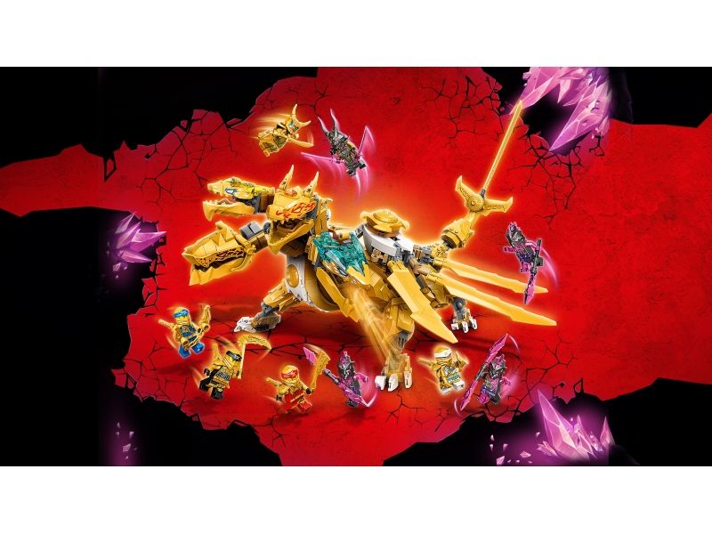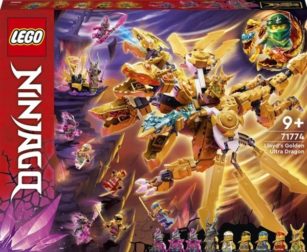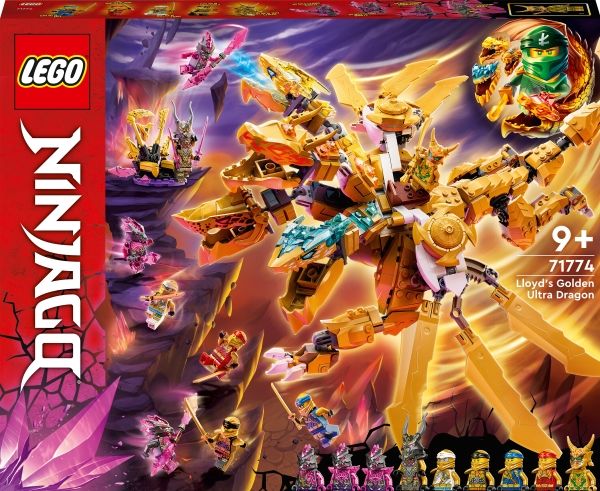 Lloydin kultainen ultralohikäärme (71774) setin parissa 9 vuotta täyttäneet lapset voivat leikkiä NINJAGO®: Crystallized ‑tv-sarjasta tuttuja tarinoita. Lelusetti sisältää kaikkien aikojen suurimman NINJAGO-lohikäärmeen, jolla on 4 päätä, taipuisat jalat ja liikuteltava pyrstö sekä siivet, jotka voi taittaa 3 teräksi – ja kaikki osat hohtavat kullan kiiltoa!