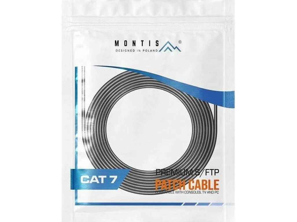 Montis KABEL SIECIOWY S/FTP MT041-10 CAT.7 10M. Cable length: 10 m, Cable standard: Cat7, Cable shielding: S/FTP (S-STP), Connector 1: RJ-45, Connector 2: RJ-45, Connector contacts plating: Gold, Data transfer rate: 10000 Mbit/s