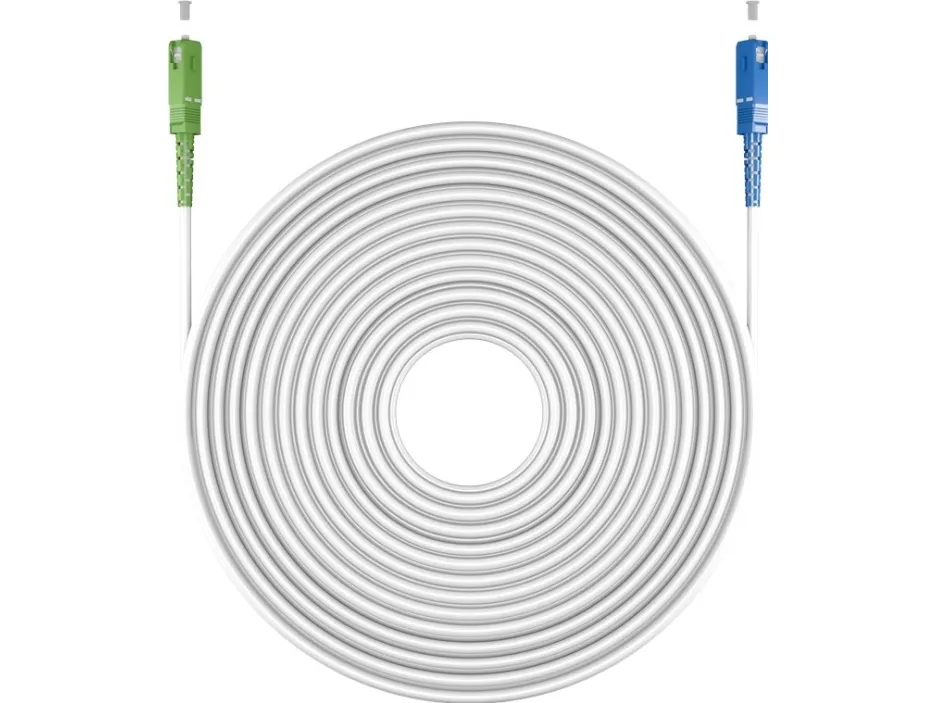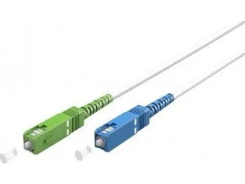 fiberoptisk kabel, stik SC-APC (8°) > SC stik (UPC), halogenfri kabelkappe (LSZH) Kabellængdesingle-mode fiberoptisk kabel designet til forbindelsestyper som f.eks. FTTH, FTTB, FTTx og til brug i hjemmet, på kontoret, i datacentre osv. som patchkabel udgør den forbindelsen mellem husets overføringssted og fiberoptisk modem (ONT) indendørsfiberoptisk kabel til op til 100 Gbit/s som er bøjningsoptimeret og pladsbesparende med en minimal bøjningsradius på 30 mm (static) LSZH-kompatibel: kabelkappen er halogenfri og flammehæmmende i henhold til IEC 60754 2, IEC 60332 1 og IEC 61034kabelaflastning forstærket med aramidgarn giver ekstra stabilitetudstyret med støvbeskyttelseskapper, stik: simplex, fibertype: OS2, SM singlemode 9/125µm i henhold til ITU T G. 657individuel testprotokol med måling af return loss og insertion loss