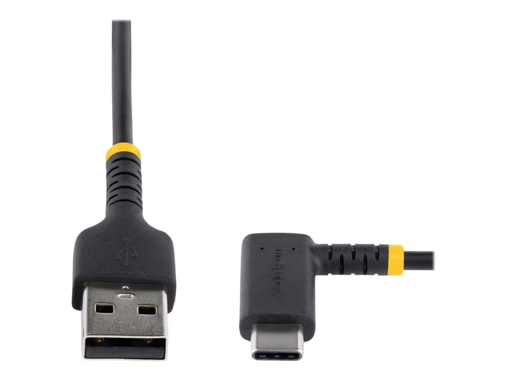 This rugged USB-A to right angle USB-C cable can be used to connect and/or charge a USB peripheral. Conveniently connect USB-C enabled devices at a right angle to the cable for organized cable routing solutions.