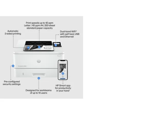 HP LaserJet Pro 4002dw -tulostin, Mustavalkoinen, Tulostin varten Pienet ja keskikokoiset yritykset, Tulostus, kaksipuolinen tulostus; nopea ensimmäisen sivun tulostus; pieni koko; energiaa säästävä; vahva suojaus; kaksikaistainen Wi-Fi, Laser, 1200 x 1200 DPI, A4, 40 ppm, Kaksipuolinen tulostus, Valkoinen