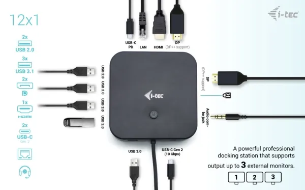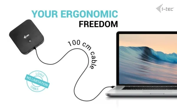 Discover a solution for expanding your workspace with the i-Tec port expansion docking station. This device transforms a single USB-C connection into a powerful workstation, offering dual DisplayPort and HDMI outputs, multiple USB ports, and a Gigabit Ethernet connection. Whether you're a professional needing to connect multiple monitors at high resolutions or looking to streamline your desk setup, this docking station delivers. With support for up to 5K resolution on DisplayPort 1.4 with DSC, your visual content will be sharper and more vibrant. The integrated USB-C cable ensures a hassle-free connection to your laptop or PC, while the metal housing provides durability and a sleek, professional appearance. Additionally, the inclusion of a Kensington security slot offers peace of mind in any environment. Elevate your workspace with the i-Tec docking station, designed for efficiency, security, and performance.