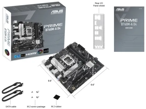Armoury Crate Within a single intuitive interface, Armoury Crate offers easily customized Aura Sync RGB settings for every compatible device in your arsenal , plus controls for an ever-growing family of ASUS products, including keyboard and mouse preferences. Armoury Crate also integrates product registration and a news feed so that you never miss updates of interest to the ASUS community.ASUS PRIME B760M-A D4-CSM. Processor manufacturer: Intel, Processor socket: LGA 1700, Compatible processor series: Intel® Celeron®, Intel® Pentium® Gold, Intel® Core™ i3, Intel® Core™ i5, Intel® Core™.... Supported memory types: DDR4-SDRAM, Maximum internal memory: 128 GB, Memory slots type: DIMM. Supported storage drive interfaces: M.2, SATA III, Supported storage drive types: HDD & SSD, RAID levels: 0, 1, 5, 10. Ethernet interface type: 2.5 Gigabit Ethernet. Component for: PC, Motherboard form factor: micro ATX, Motherboard chipset family: Intel